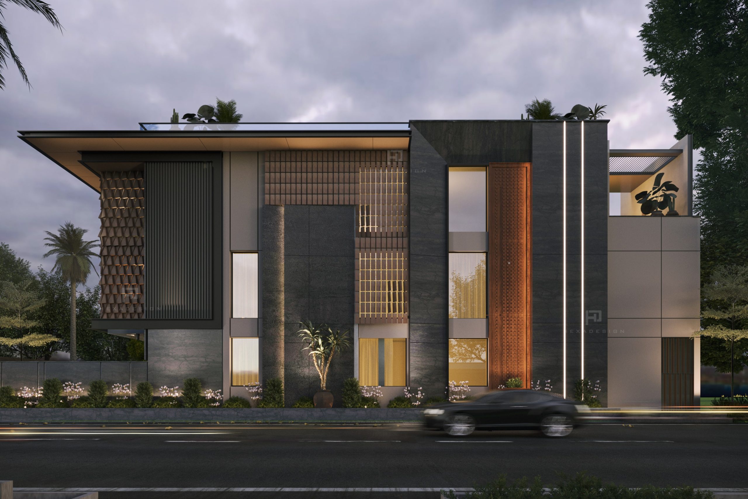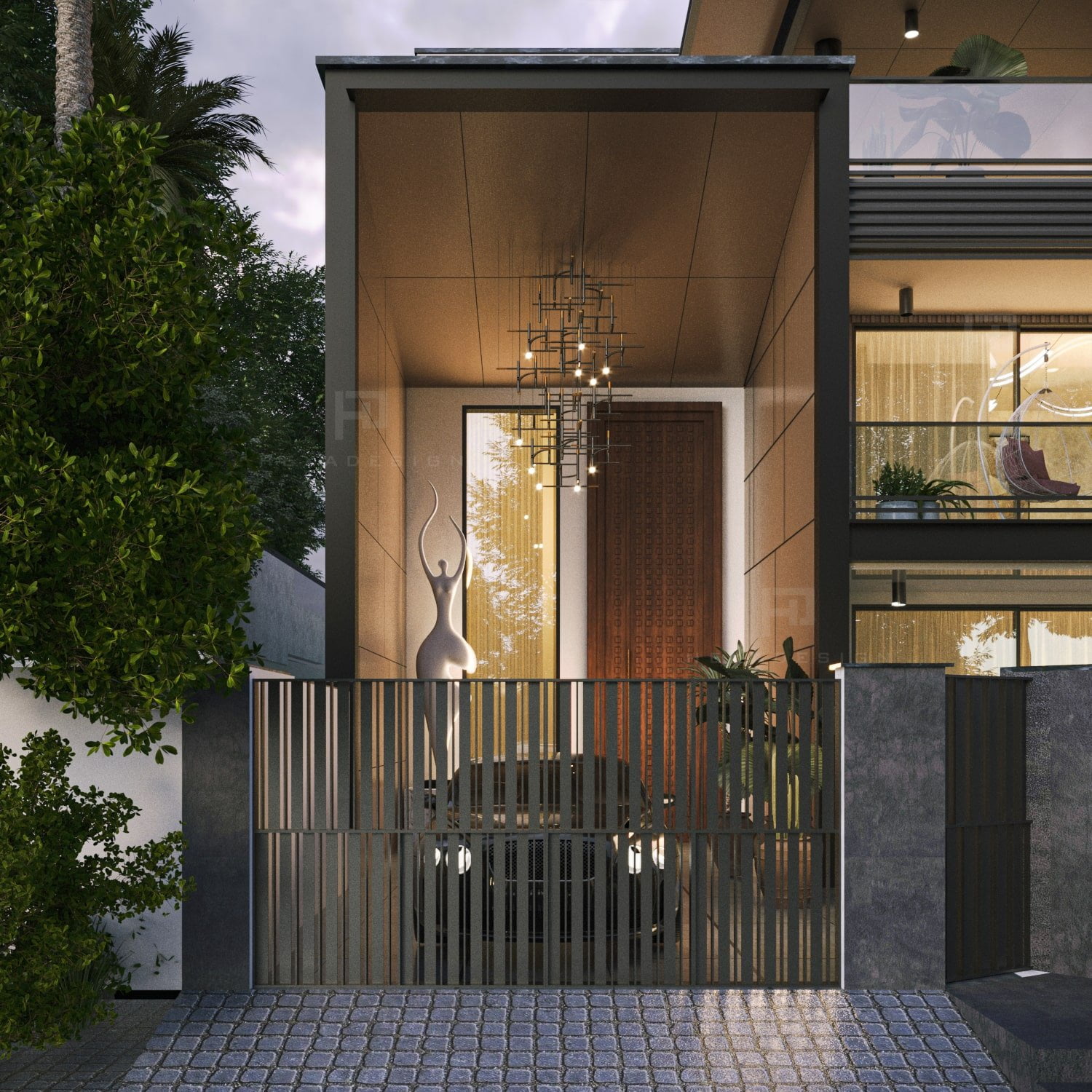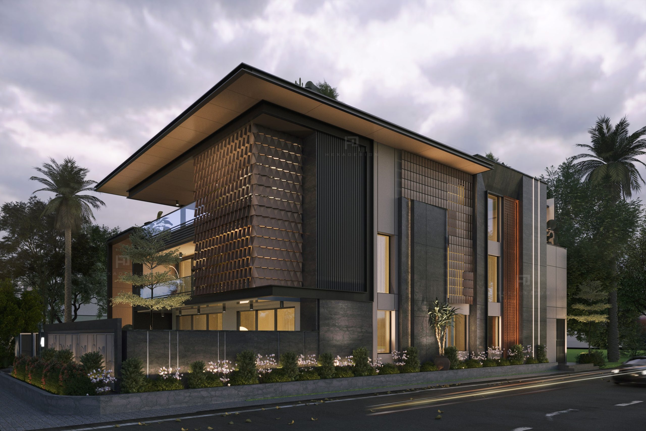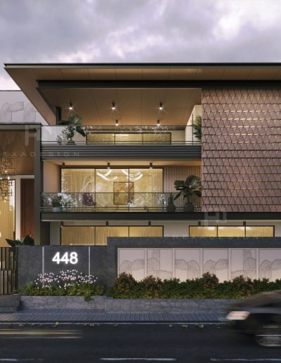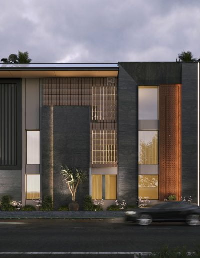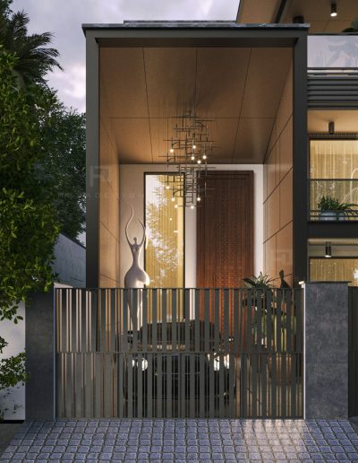 The modern elevation seamlessly blends innovation with aesthetics, prominently featuring zinc panels that elevate the structure to new heights of sophistication. The choice of zinc not only adds a distinct metallic allure but also provides durability and resilience against the elements. The panels are strategically placed to create a sense of rhythm and balance, enhancing the overall visual appeal.